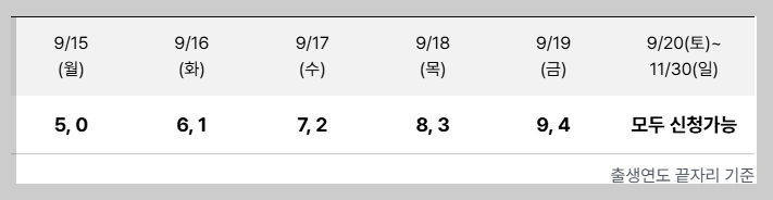 - 출생 연도 끝자리 기준으로 신청 요일이 제한됩니다.