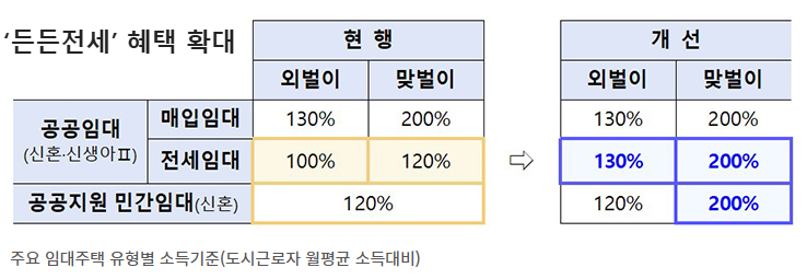 ✅ 맞벌이 신혼·출산 가구 소득 기준 완화 (기준 상향: 120% → 200%)