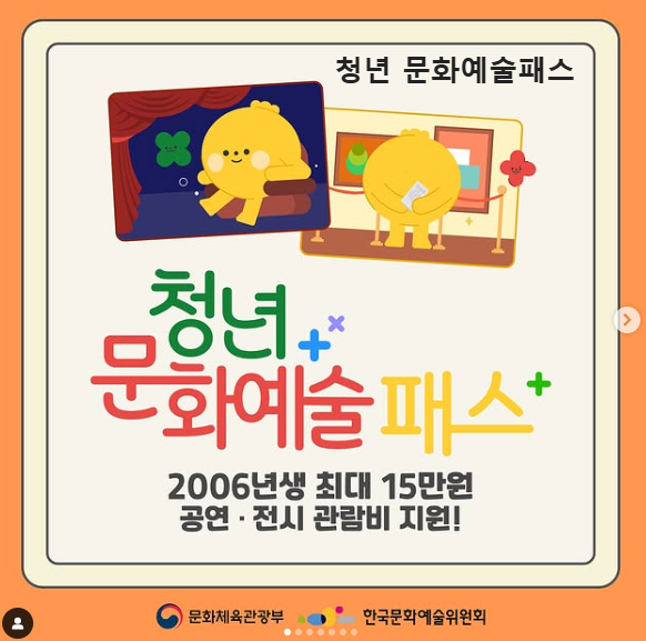 문화체육관광부와 한국문화예술위원회가 올해 19세가 되는 2006년생 청년을 대상으로 최대 15만원의 '청년 문화예술패스'를 지원합니다! 공연과 전시를 무료 또는 저렴하게 즐길 수 있는 기회니까 놓치지 마세요. 😊